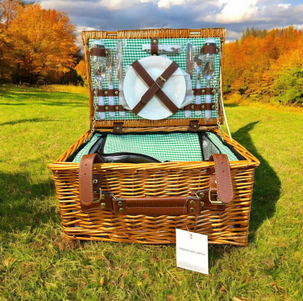Canasta de Picnic Familiar con Copas y Accesorios:** Esta canasta está diseñada para fomentar momentos especiales en familia o para ser un regalo encantador. Incluye todo lo necesario para disfrutar de un día al aire libre con un delicioso picnic