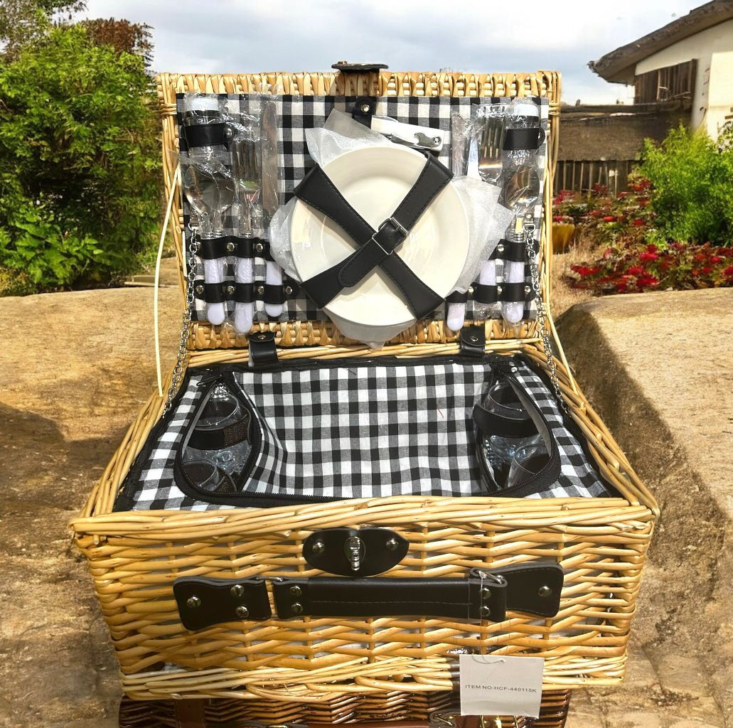 Canasta de Picnic Familiar con Copas y Accesorios:** Esta canasta está diseñada para fomentar momentos especiales en familia o para ser un regalo encantador. Incluye todo lo necesario para disfrutar de un día al aire libre con un delicioso picnic