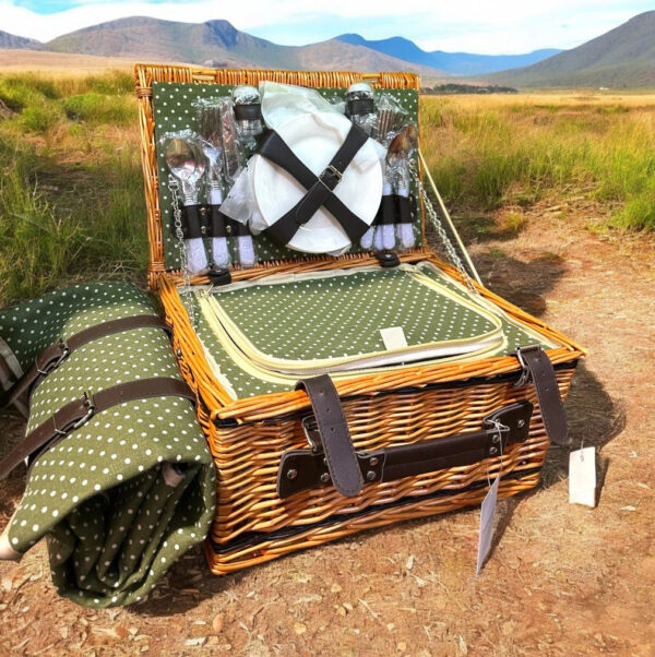 Canasta de Picnic Familiar con Copas y Accesorios:** Esta canasta está diseñada para fomentar momentos especiales en familia o para ser un regalo encantador. Incluye todo lo necesario para disfrutar de un día al aire libre con un delicioso picnic